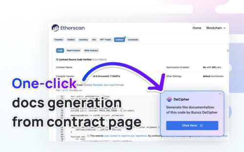 Bunzz, a Singapore-based web3×LLM tech web3-startup, is thrilled to announce the successful release of “DeCipher“, a revolutionary AI-powered tool designed to transform the process of generating Smart Contract documentation. Users can create documents from nearly all Smart Contracts existing on each Blockchain with a single click.